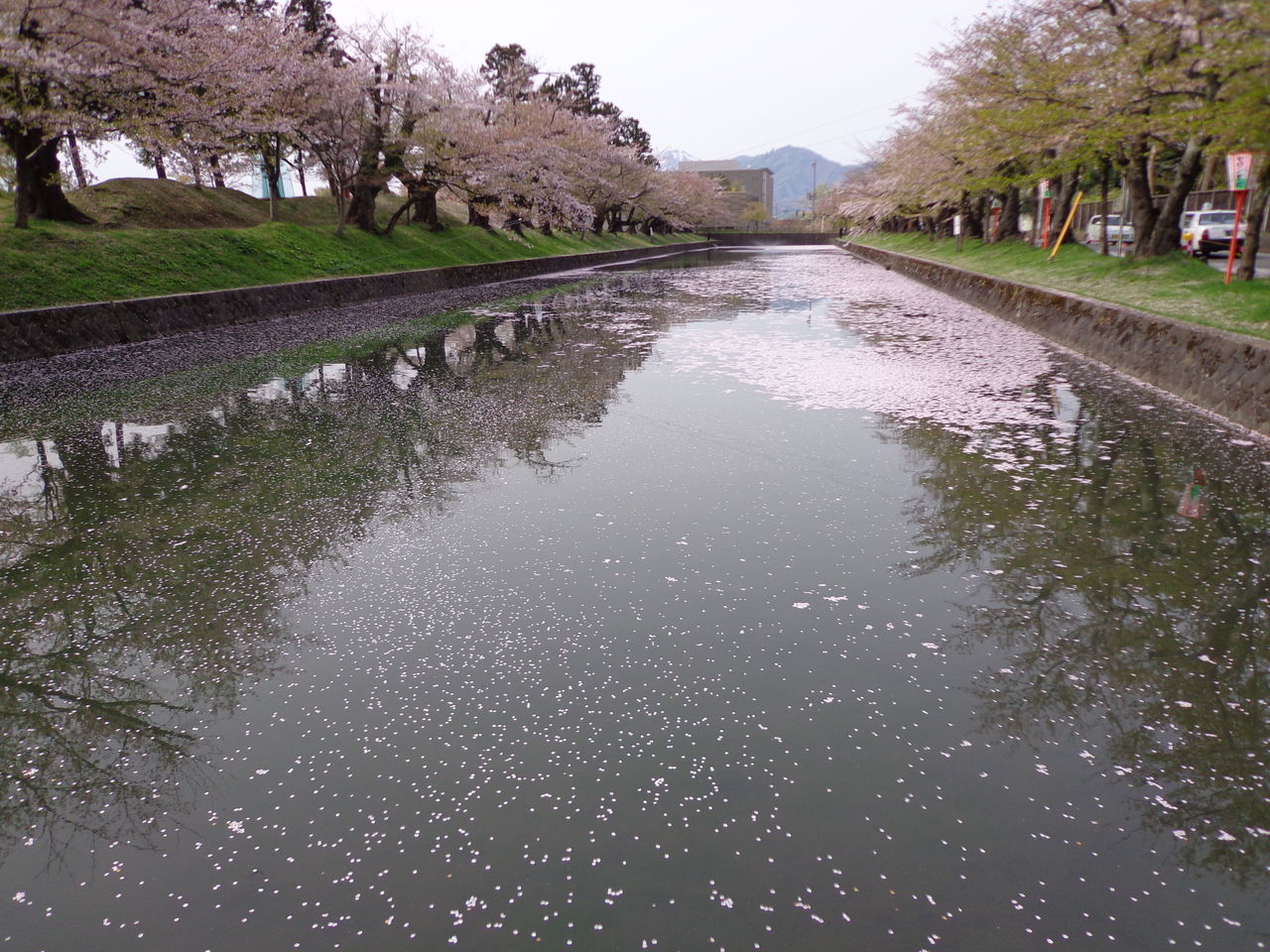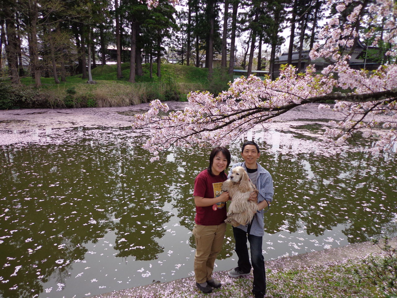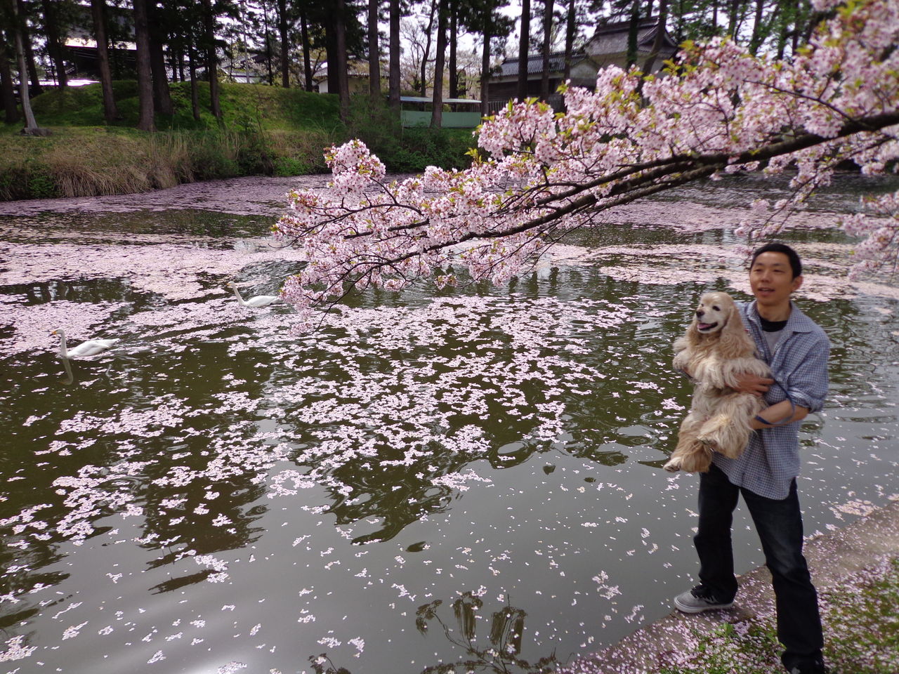 もう、散ってる途中でしたが、その花びらが、お濠に浮かんでピンクになって、